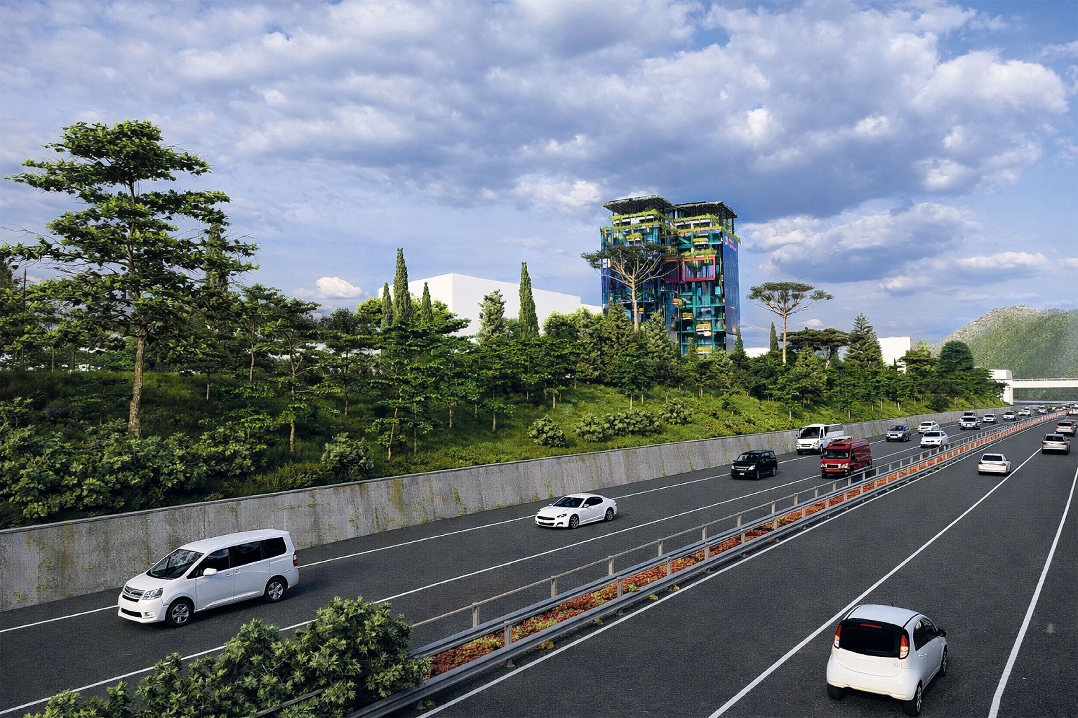 riflessi e variazioni luminose. Durante il giorno, i diversi colori filtrano la luce naturale producendo un effetto dinamico e mutevole; nelle ore notturne, l’illuminazione interna trasforma l’edificio in un volume luminoso stratificato, rendendo il colore un vero e proprio materiale costruttivo. Il contrasto tra trasparenze, opacità e tonalità cromatiche rompe la rigidità del volume verticale, restituendo un’immagine architettonica vibrante e riconoscibile. L’edificio integra logge verdi, terrazze e sistemi di vegetazione verticale, che dialogano con la pelle vetrata creando un equilibrio tra artificio e natura. Il progetto, sviluppato come rendering architettonico 3D, propone una visione